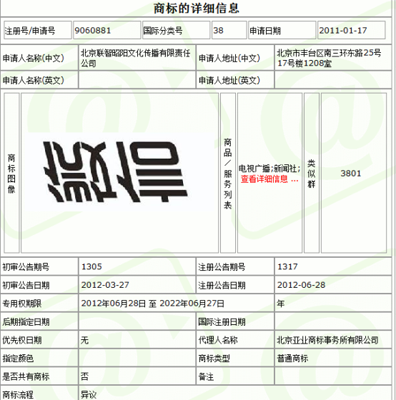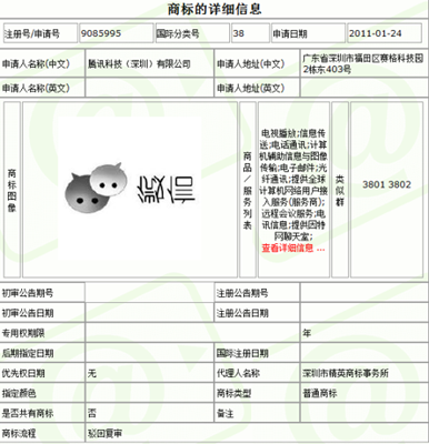 其中,最關(guān)鍵的第38類電信及通信服務(wù)被北京聯(lián)智昭陽文化傳播有限責(zé)任公司(以下簡稱“聯(lián)智”)搶注,申請日期為2011年1月17日,而騰訊公司對第38類商標(biāo)的申請日期為2011年1月24日,較上述公司晚一個(gè)星期。